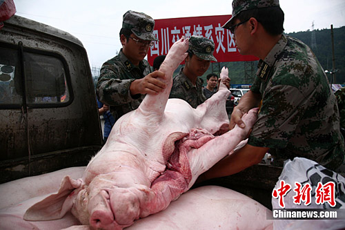 8月19日,阿坝州政府为奋战在映秀镇泥石流灾区的武警官兵送去两千斤猪肉,以改善武警官兵伙食。阿坝州汶川境内因近日强降雨而引发的泥石流阻断道路、冲毁房屋,泥石流冲出物致使岷江河道淤塞,灾后重建的映秀新城受到洪水威胁。
