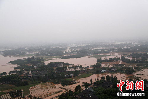 8月19日17时许,成都军区某陆航团接到紧急救援蒲江县甘溪镇被洪水围困群众的命令后,团长栗国带领两架直升机冒雨升空,救出被困群众30人,向灾区运送救援人员10人,空投食品、干粮200余公斤。图为被洪水围困的村庄。李佳 摄