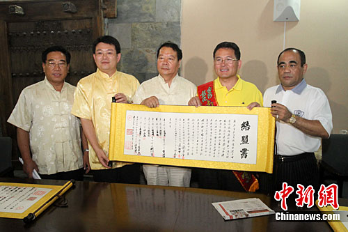 8月20日,台湾彰化市市长、南瑶宫管理人邱建富率彰化南瑶宫十妈会参访团一行38人,到天津天后宫进香,并与福建漳州乌石天后宫、天津天后宫三方签约,缔结为友好宫庙。中新社发 郭晓帆 摄