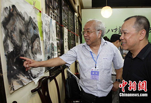 8月20日,参加“情系八桂——两岸文化联谊活动”的书法家、画家,在广西桂林靖江王府进行“笔会”交流。图为台湾著名画家李锡奇(左)、广西师范学院副院长白晓军共同完成画作,并交流心得。中新社记者 张宇 摄