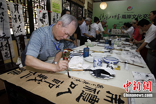 8月20日,参加“情系八桂——两岸文化联谊活动”的书法家、画家,在广西桂林靖江王府进行“笔会”交流。图为台湾著名书法家陈炫明现场挥毫。中新社记者 张宇 摄