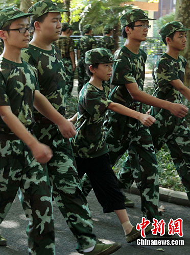 8月20日,中国科学技术大学2010级的本科新生在军训中。来自江西的少年班学生涂醒洲今年仅13岁,因为身材太小,没能找到合适的军裤,只好穿着便装参加军训。中新社发 张娅子 摄