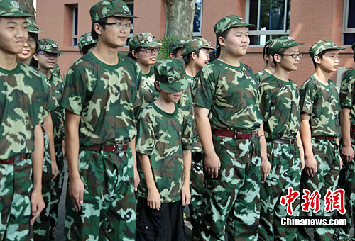 8月20日,中国科学技术大学2010级的本科新生在军训中。来自江西的少年班学生涂醒洲今年仅13岁,因为身材太小,没能找到合适的军裤,只好穿着便装参加军训。图为调皮的涂醒洲站队时故意用帽子挡着脸。中新社发 张娅子 摄