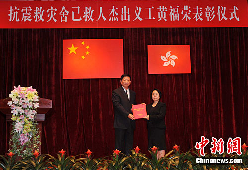 8月20日,在玉树地震中舍身救人的香港义工黄褔荣的义举得到国家的肯定,国家人力资源和社会保障部部长尹蔚民专程到港,代表国务院在香港的中联办大楼隆重举行宣读表彰决定,授予黄褔荣“抗震救灾舍已救人杰出义工”称号。图为尹蔚民部长在仪式上向黄褔荣的姐姐黄月秀颁授证书。邓庆乐 摄