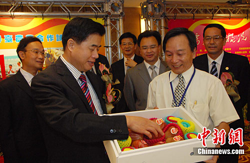 8月20日下午“台湾·广东周”海峡两岸农业论坛在台湾台南县举行,正在台湾参观交流的广东省省长黄华华一行在会前兴致勃勃参观水果展览并果农进行了交流,了解当地水果生产情况。梁永强 摄