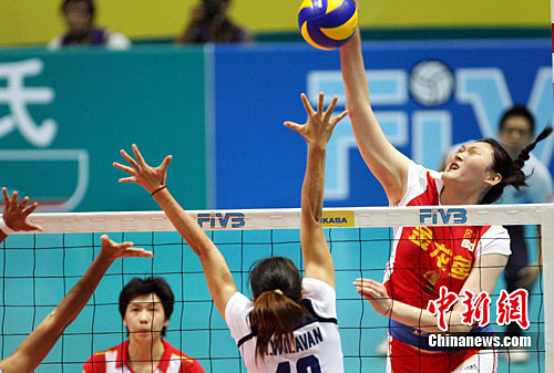8月20日,“2010世界女排大奖赛-香港”站在香港体育馆拉开战幕。来自中国、德国、美国及泰国的四支女排队伍将在3天的赛事中角逐桂冠。图为首日赛事上中国女排迎战泰国女排,1号王一梅大显身手。中新社发 洪少葵 摄