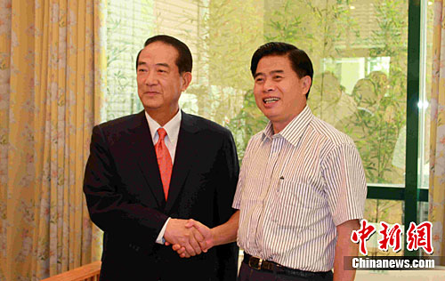 中新网台南8月20日电 台湾亲民党主席宋楚瑜今天在台南会见到访的广东省省长黄华华,并与黄华华在台南县的走马濑农场一道见证广东经贸文化交流团在当地采购的水果启运仪式。张传熙 摄
