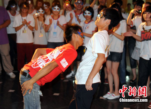 8月20日晚,在福州参加第七届榕台青年夏令营联欢会的台湾中学生激情四射地表演街舞,博得两岸中学生营员的喝彩。当日,“跨越海峡·相约世博”——第七届榕台青年夏令营在福州开营。中新社发 刘可耕 摄