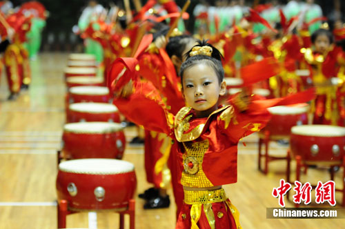 8月21日上午,北京市第八届民族传统体育运动会开幕式在北京举行,图为开幕式文艺演出中小鼓手们的精彩表演。中新社记者 侯宇 摄