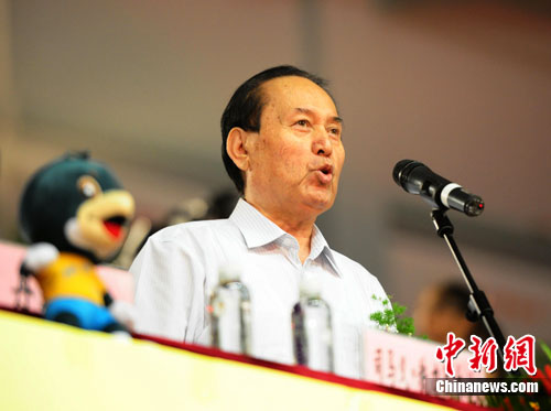 8月21日上午,北京市第八届民族传统体育运动会开幕式在丰台区光彩体育馆举行,全国人大常委会副委员长司马义・铁力瓦尔地宣布运动会开幕。中新社记者 侯宇 摄