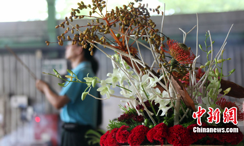 8月21日,台北市近千市民在当地最大的花卉批发市场举办“万花祈福祭”,提倡市民在农历7月中元祭以芬芳的花卉代替香烛金纸,为环保尽一份心力。一些市民难适应新风尚,依惯例燃香祭祀,祈求一年顺利如意。中新社记者 刘舒凌 摄