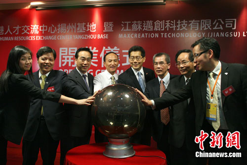 8月21日,香港人才交流中心扬州基地暨江苏迈创科技公司开业仪式在名为“中国声谷”的江苏信息服务产业基地(扬州)举行。香港特别行政区商务及经济发展局副局长苏锦梁(右四)、港区全国人大代表、立法会议员叶国谦、港区全国政协委员、香港中华总商会常务理事长、香港人才交流中心主席刘宇新、江苏省委宣传部副部长司锦泉(左四)和扬州市委副书记王荣平(左三)等出席。香港人才交流中心扬州基地的建立将继续发掘香港在现代服务业及人力资源服务方面的优势和经验,与更多的内地伙伴通力合作,为更广泛的地区在产业升级和发展方面建构人力资源的基石。中新社记者 崔佳明 摄