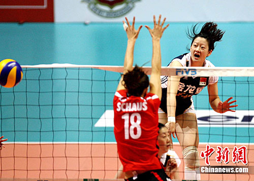 8月21日,“2010世界女排大奖赛香港站”赛事进入第二天,中国女排再下一城,以3 :0的局数击败对手德国队。中新社发 洪少葵 摄