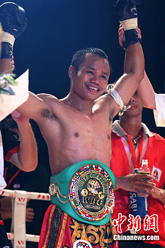 8月21日20时30分,龙行天下国际职业搏击拳王争霸赛在海口体育馆开战,来自泰国、美国、意大利以及中国等9个国家14位现役职业搏击拳王椰城争霸。图为泰国拳王Jaroenchai Ood-Donmuang夺得世界拳击理事会(简称WBC)轻量级世界冠军金腰带。中新社发 付美斌 摄