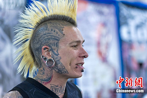 当地时间8月21日,美国旧金山举办2010度人体纹身大展。图为一位朋克装扮的纹身师傅展示他喜爱的图案。中新社发 陈钢 摄