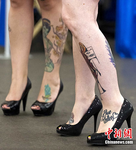 当地时间8月21日,美国旧金山举办2010度人体纹身大展。图为两位女子在腿部纹上色泽鲜艳的图案。据悉,纹身按小时收费,每小时120美元左右。中新社发 陈钢 摄