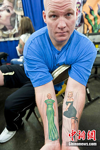 当地时间8月21日,美国旧金山举办2010度人体纹身大展。图为一位男子展示他刚刚完成的美国电影明星梦露和特纳的照片纹身。据悉,纹身按小时收费,每小时120美元左右,这个男子花费了大约6个小时完成这两幅照片纹身。中新社发 陈钢 摄