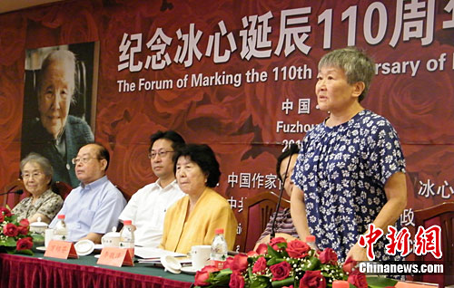 8月22日,中国“文坛祖母”冰心的女儿、北京外国语大学教授吴青(右一)回忆起母亲冰心,不禁哽咽泪下,吴青称作为冰心女儿感到无比自豪,冰心一直以来都是她的榜样。当天,来自海内外近200名学者、文艺界代表聚首在冰心故乡福建福州,纪念冰心诞辰110周年,对冰心的作品影响、大爱精神等方面进行交流,畅谈对这位世纪老人的美好回忆。