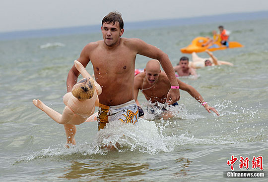当地时间8月22日,一场别开声面的搞笑游泳比赛在俄罗斯西伯利亚城市新西伯利亚举行,数十名俄罗斯壮汉怀抱“充气娃娃”跃入河中进行游泳比赛。不过,从比赛实况来看,很显然这些参赛者并没有把充气娃娃当“伴侣”来对待,多半都当成游泳圈,使得气氛既搞笑却又带点诡异。