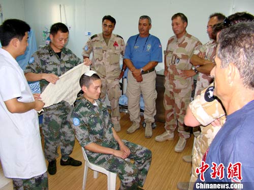 8月22日,来自6个国家的7名军事观察员来到中国驻黎巴嫩维和二级医院,认真聆听了中国军医讲授的救护知识并现场观摩、体验了各种战场救护包扎技术。图为中国二级医院医护人员为军事观察员演示战场包扎方法