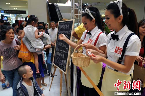 8月22日,食肆酒楼荟萃的香港长发广场举行揭幕礼,一脸猫妆的礼仪小姐向观看仪式的顾客派发美味食品,与“上帝”套近乎。 中新社记者 郑祚声 摄
