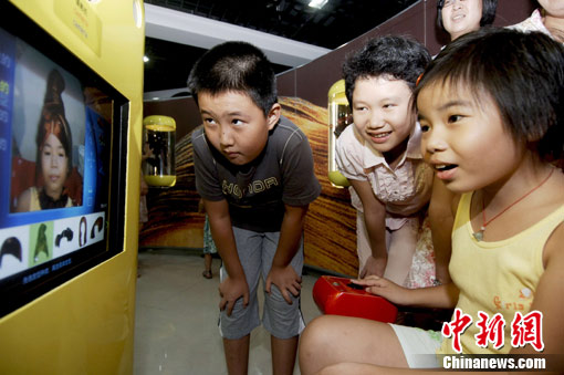 8月23日,福州小朋友在仪器中现场体验未来发型设计。当日,“破解头发的奥秘”大型展览在福建科技馆举行,此次展览分为从生命到物质、产品科学、模拟发廊及世界之发4个部分,通过有趣的图片、模型及栩栩如生的视听效果,全面调动参观者对“头发”的兴趣。