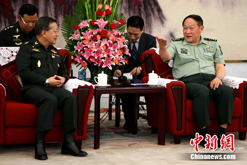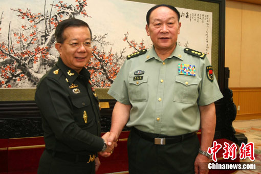 8月23日,中国国务委员兼国防部长梁光烈在北京八一大楼会见泰国国防部次长阿披猜。中新社记者 富田 摄