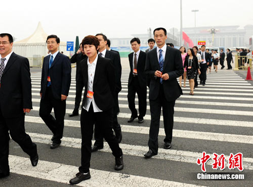 8月24日上午,曾在2010年温哥华冬奥会上夺得4枚金牌的中国著名女子短道速滑选手王濛(左三)作为全国青年代表,出席在北京人民大会堂举行的中华全国青年联合会第十一届委员会全体会议开幕式。中新社记者 侯宇 摄