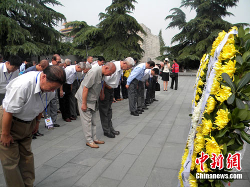 8月24日,海峡两岸及海外的黄埔同学、亲友相聚南京,参加“纪念抗日战争胜利65周年黄埔论坛”。当年的热血青年,如今已是耄耋老人,他们在侵华日军南京大屠杀遇难同胞纪念馆内参观,默哀并献花,寄托哀思。中新社记者 朱晓颖 摄