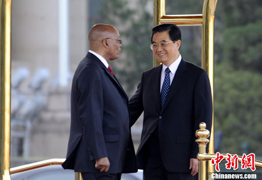 8月24日,中国国家主席胡锦涛在北京人民大会堂东门外广场举行仪式欢迎南非总统祖马访华。中新社发 廖攀 摄