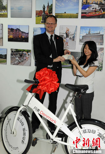 8月24日,为庆祝丹麦签证中心在北京成功运营,丹麦驻华使馆副大使姚朔仁(左)主持庆祝活动。图为第1000位签证申请者(右)现场获赠一辆上海世博会丹麦馆的特制自行车,2010年是中丹建交60周年。中新社发 张勤 摄