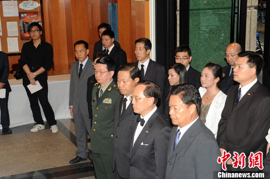 8月24日18时许,香港特区特首曾荫权、中央人民政府驻港联络办主任彭清华、外交部驻港特派员吕新华、解放军驻港部队副政委饶建新,前往礼顿山社区礼堂凭吊遇难同胞。中新社发 郑祚声 摄