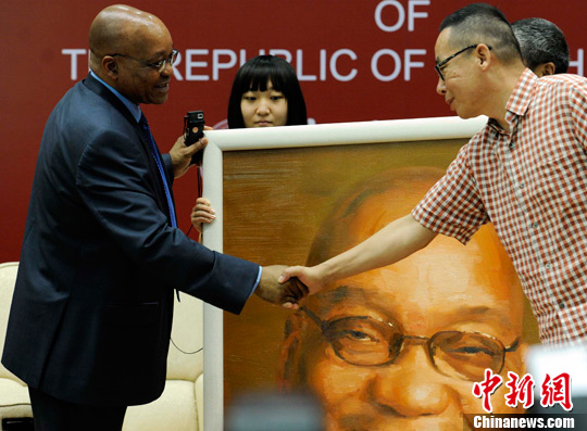 8月25日,南非共和国总统祖马来到中国人民大学演讲。图为演讲结束后,人民大学老师把自己创作的祖玛总统的油画像赠送给祖玛。中新社发 刘震 摄