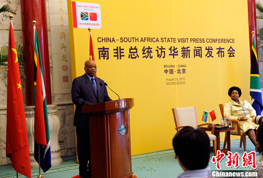 8月25日下午,南非共和国总统祖马在北京钓鱼台国宾馆召开新闻发布会,介绍访华成果。中新社发 刘震 摄
