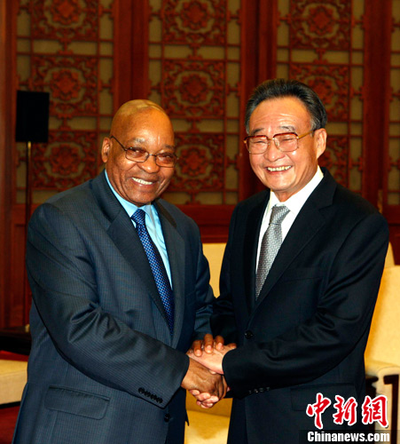 8月25日,全国人大常委会委员长吴邦国在北京人民大会堂会见南非总统祖马。中新社发 任海霞 摄