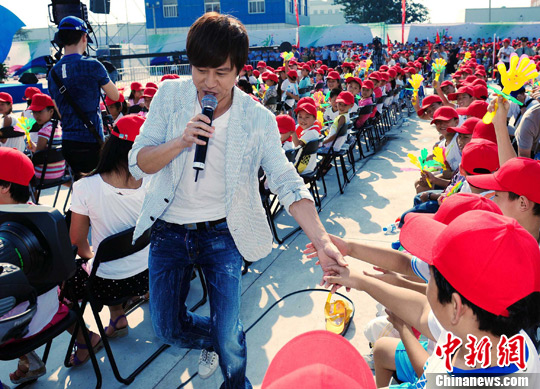 8月25日下午,中华全国青年联合会第十一届委员会全体会议组织与会青年委员前往北京新发地农产品批发市场,与在此务工的农民工及其子女们进行联欢。图为青联委员、著名歌手解晓东走进孩子们中间演唱歌曲。中新社发 侯宇 摄