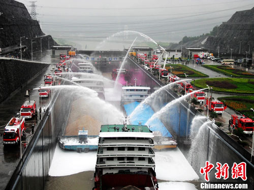 8月26日9时,三峡船闸北二闸室l艘过闸的千吨级汽油轮突然“起火”油仓发生“爆炸”,有13名船员被困生命“岌岌可危”。三峡枢纽应急救援总队和宜昌市应急救援支队的消防、交警、公安、武警、医疗、环保、通讯、气象等各支部队200余人联合展开1个小时的生命大救援,13人平安救出,油轮着火点完全扑灭。这是今年首次举行的三峡船闸油轮火灾灭火救援演练。