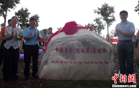 8月27日,中越青年代表在广西防城港共同栽下象征两国友谊万古长青的“友谊树”后,越南共青团中央组织部副部长、执行委员会委员陈青林(左二)与防城港市政府副市长赵磊(右一)共同为“中越青年(防城港)友谊林”揭牌。中新社发 陈紫娟 摄