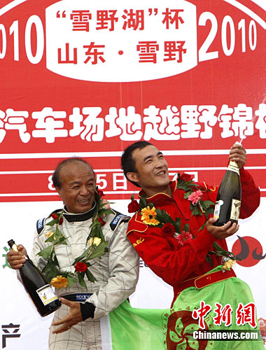 8月27日,2010“雪野湖”杯山东·雪野中国汽车场地越野锦标赛在山东莱芜市落幕,雨林俱乐部香港车手李志明(左)与领航员朱思洲密切配合夺得无限改装组冠军。中新社记者 赵振清 摄