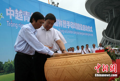 8月28日,中共中央政治局委员、中央书记处书记、中组部部长李源潮,越共中央政治局委员、中央书记处书记、中组部部长胡德越出席仪式,并留下中越友谊纪念手印,共同启动手印墙建设仪式。林艳华 摄