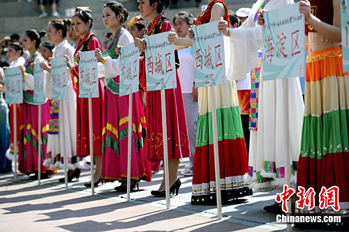 图为北京市各个区县的运动员代表身着鲜艳的民族服装出席闭幕式。中新社记者 刘震 摄