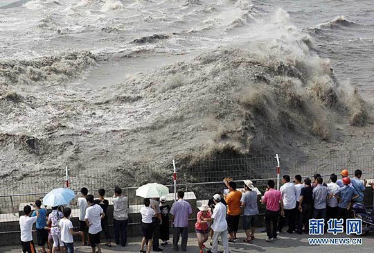 8月27日,游客在杭州萧山区美女坝观潮点观赏壮观的“回头潮”。