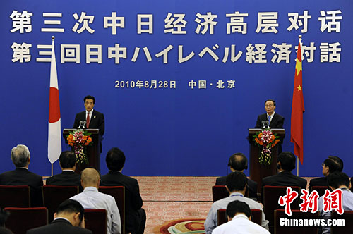 8月28日,第三次中日经济高层对话在北京结束,中日双方共签署了七项合作文件。会谈结束后,中国国务院副总理王岐山与日本外相冈田克也共同会见了记者。中新社记者 刘震 摄