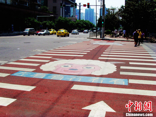中新网重庆8月29日电 (孟幻)8月29日,新学期即将开始,一条位于重庆珊瑚小学附近的斑马线早已焕然一新,出现了“喜羊羊”与“灰太狼”的图案,并印上安全标语提醒过往行人安全过马路。