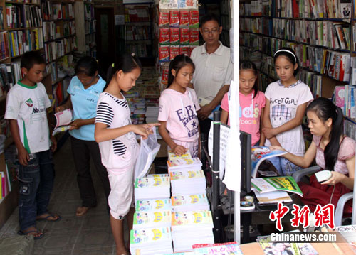 8月30日,广西河池市罗城仫佬族自治县学生在新华书店排队购买教辅资料、图书。当天,是罗城仫佬族自治县中小学新学年开学的第一天,广大中小学生纷纷购买文具、教辅资料,为新学年学习打下基础,“开学经济”升温。