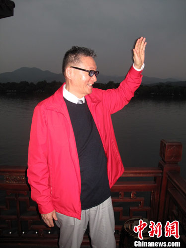 李敖向另一个船上的“粉丝”和媒体挥手致意。何鸣 摄