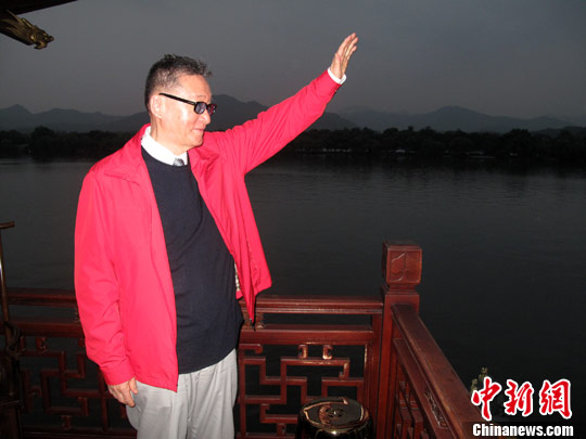 李敖向另一个船上的“粉丝”和媒体致意。何鸣 摄