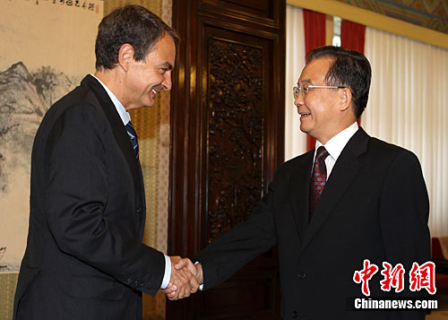 8月31日下午,中国国务院总理温家宝在北京中南海紫光阁会见前来参加上海世博会西班牙馆日活动的西班牙首相何塞·路易斯·罗德里格斯·萨帕特罗。中新社记者 任晨鸣 摄