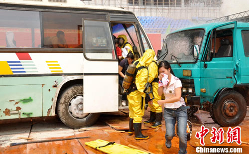 8月31日,广西壮族自治区公安、消防、卫生等多部门联合在东兴市举行大型综合应急救援演练。图为消防官兵对发生“交通事故”的车辆被困司乘人员展开“救援”。 中新社发 陈义才 摄