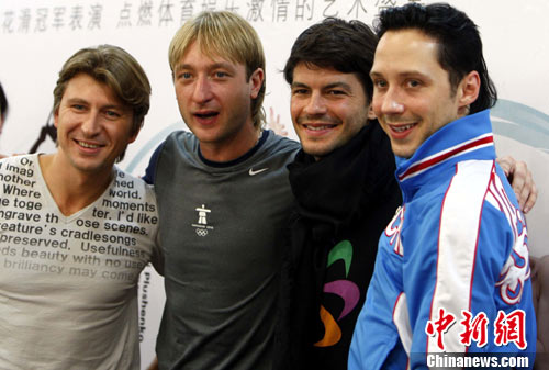 9月3日,作为国内首次举办的国际水准花样滑冰表演品牌――《2010冰上雅姿》盛典举行新闻发布会宣布:目前演出已经进入倒计时,来自世界的冠军们已陆续抵达北京并进入紧张的彩排。图为普鲁申科等出席新闻发布会。中新社记者 任海霞 摄